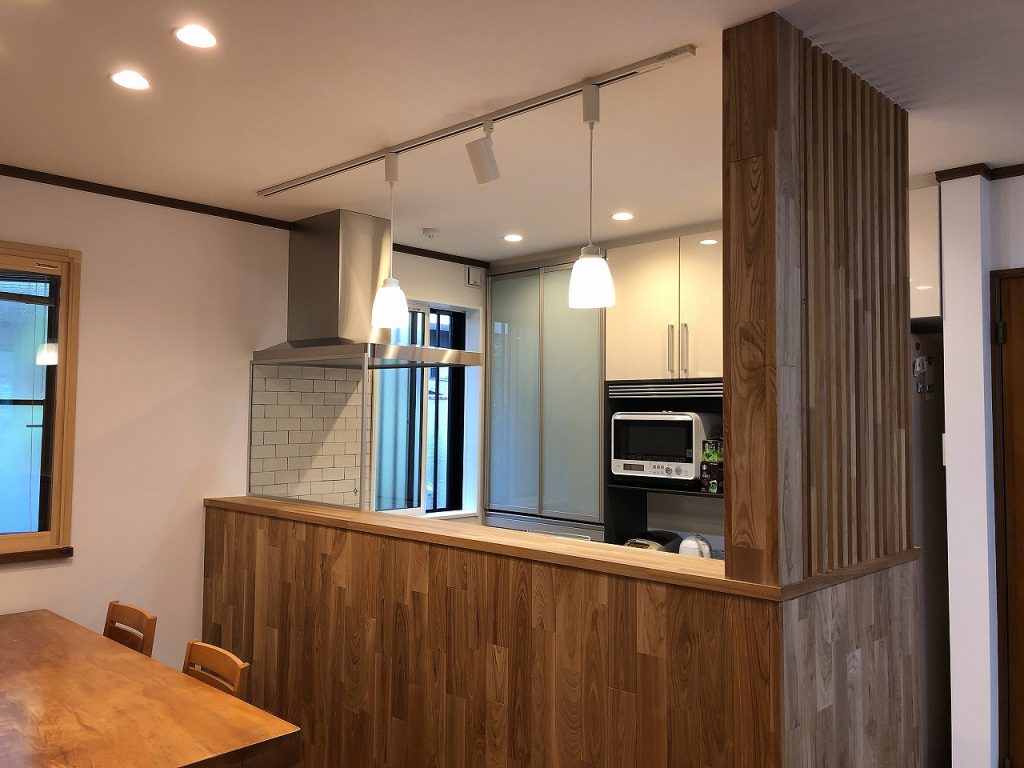 格子をタモの無垢材で造作し、モダンな感じのキッチンとなりました(トクラス)。工事費323万円(トイレリフォーム2箇所含む)