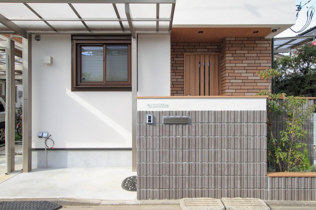 外構の計画には、ガーデンデザインも重要です。この住宅では、以前マンションにお住まいだった時代に愛着を持った樹木を生かすために花壇を設置しています。花壇はエクステリアの一部として、建物と自然の調和を図る重要な役割を担っています。また、建物の顔である玄関周りは化粧ブロックと外壁と同材の塗り壁を使用し、エクステリア全体に一体感を出しています。