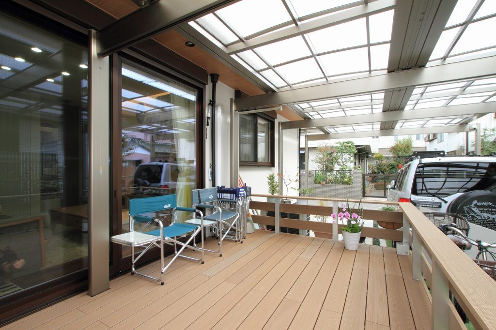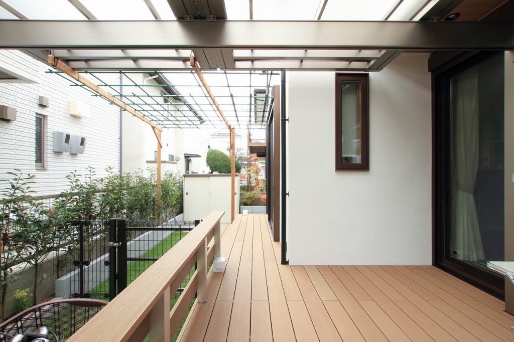 リビングからの視界を広げるウッドデッキは、外構の一環として非常に人気があります。今回紹介するウッドデッキは、耐久性とメンテナンスの容易さから樹脂素材を採用しています。樹脂ウッドデッキは自然な木目の美しさを持ちながら、腐朽や虫害の心配が少なく、長期間にわたってその美観を保つことができます。また、ウッドデッキには安全性を考慮して手摺と格子が設けられており、写真に映る愛らしいワンちゃんが外に飛び出す心配もありません。このように、外構工事においてはペットの安全も重要な要素の一つです。