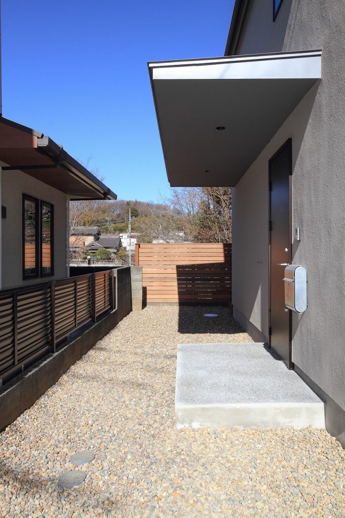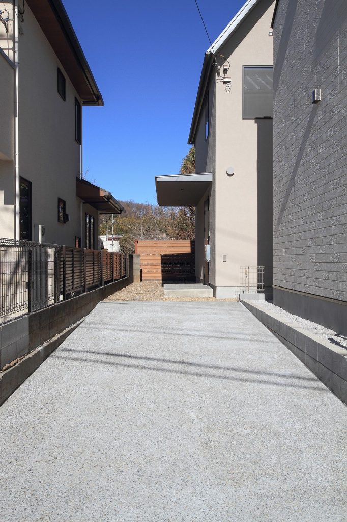 まず、敷地の路地状部分にはコンクリートの洗い出しを施しています。洗い出しとは、コンクリート表面に石の質感や色を浮き出させる技術で、エクステリアにおいて重要なデザイン手法の一つです。この技術により、外構は自然の風合いを持ちながらも、耐久性や機能性を保持することができます。
