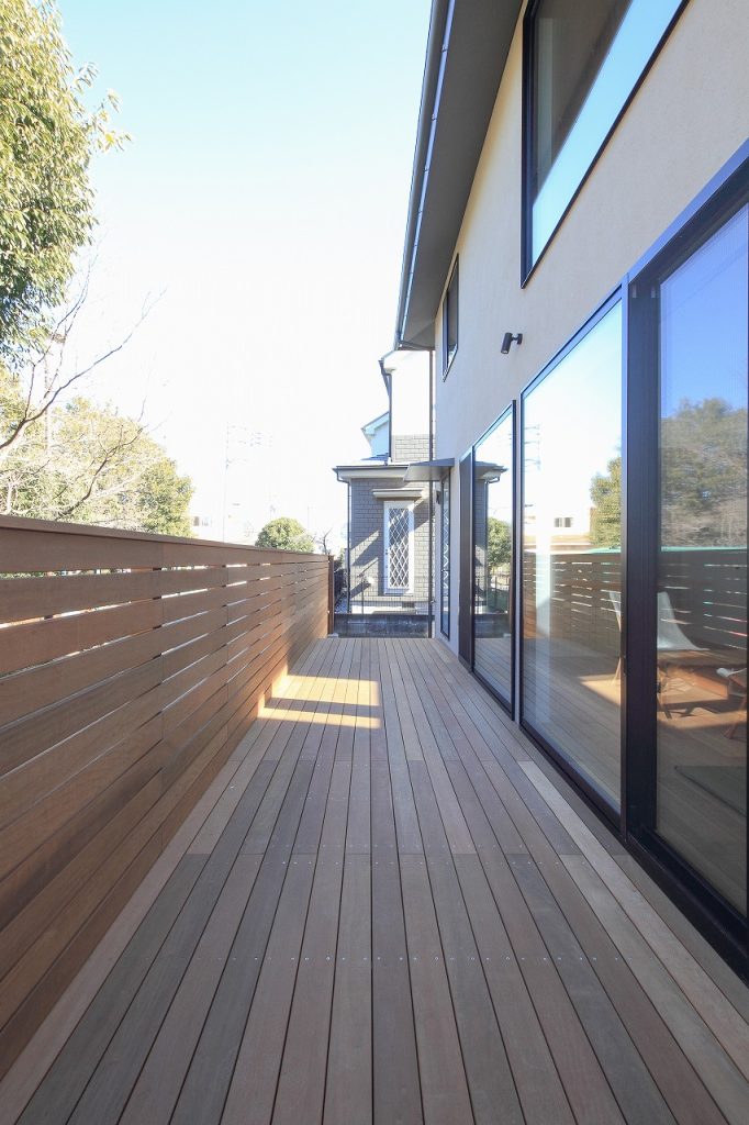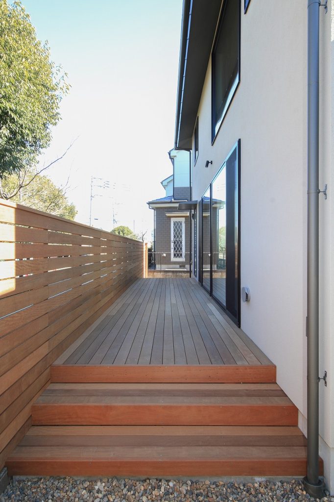 次に、リビングに面したウッドデッキは、家族や友人との交流の場として最適です。エクステリアとしてのウッドデッキは、目隠しを兼ねたデザインでプライバシーを守りつつ、リビングとのつながり感を演出しています。また、ウッドデッキはガーデンとの調和を考えて設計されており、外構全体の美しさを引き立てます。
