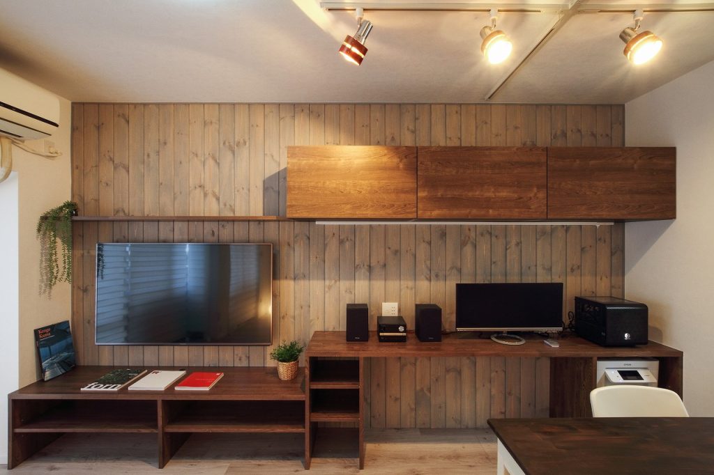 また、ご主人様が自宅でのパソコン作業を快適に行えるよう、リビングダイニングには幅広のワークデスクを新設しました。このワークデスクは、お子様がリビング学習をするのにも最適な空間を提供します。背面の壁にはパインの羽目板にオスモ塗装を施し、LDKのアクセントとしての役割も果たしています。