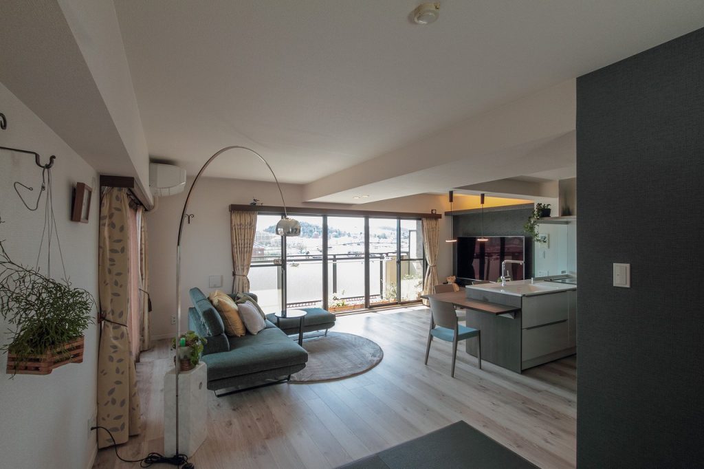 お施主様はインテリアコーディネーターとして活躍されている方で、廊下から続くアクセントクロスやソファーの色合い、照明に至るまで、トータルコーディネートされた空間は、リフォームとリノベーションの素晴らしさを体現しています。特にフロスのARCO照明は、空間にアクセントを加えるだけでなく、照明としての機能も果たしています。