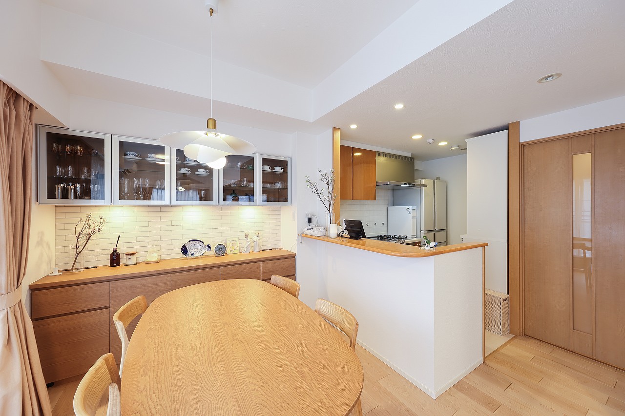 リフォームのもう一つの大きな目的が「オーダーメイドの食器棚を設置すること」でした。吊戸棚の扉には透明感のあるガラスを使用し、お気に入りの食器を美しくディスプレイできるように。下部収納は中が見えない扉付きとすることで、生活感を抑えたすっきりとした印象に仕上げました。