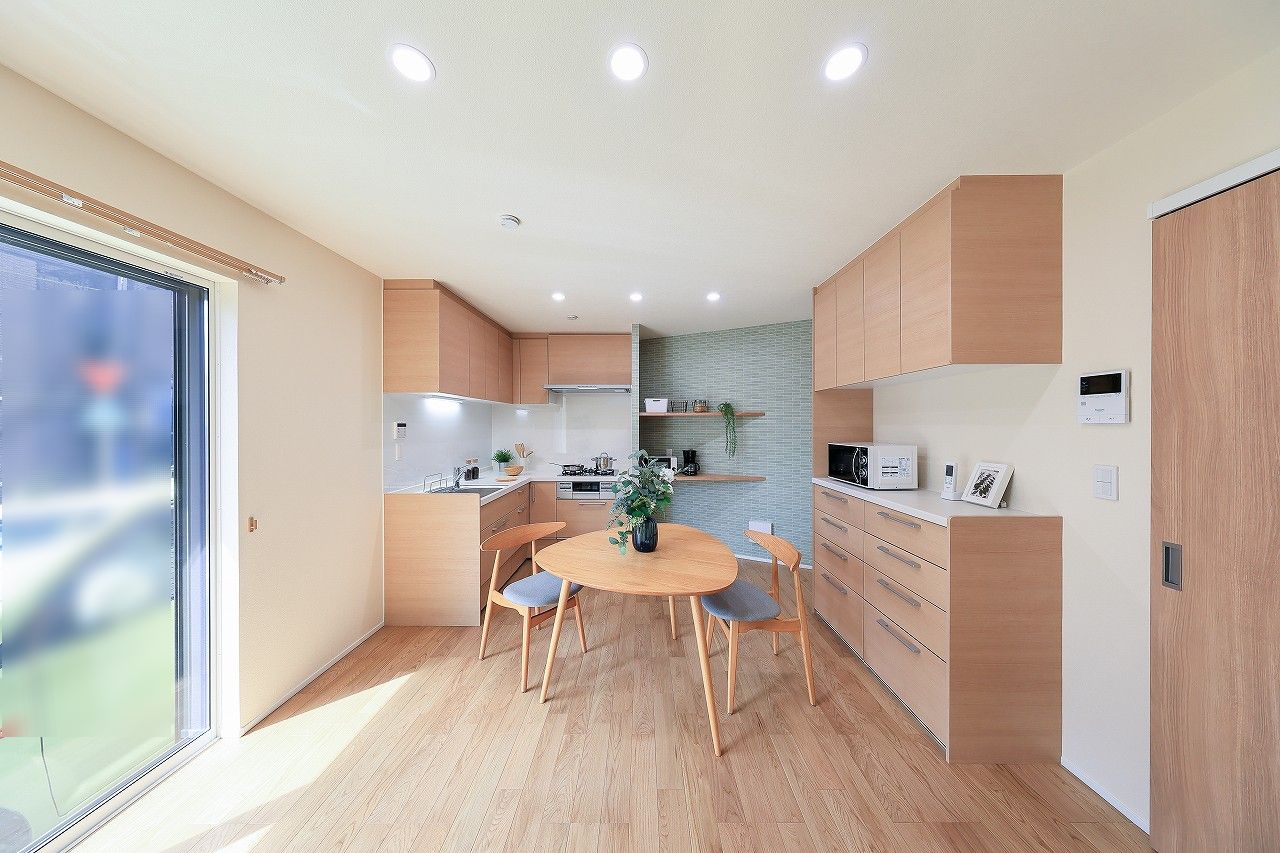 キッチンまわりにはタモ材の家電カウンターを造作し、天然木の風合いが生きるデザインにまとめました。壁の一部には落ち着いたトーンの北欧風アクセントクロスを選定し、上品で統一感のある空間に仕上げています。