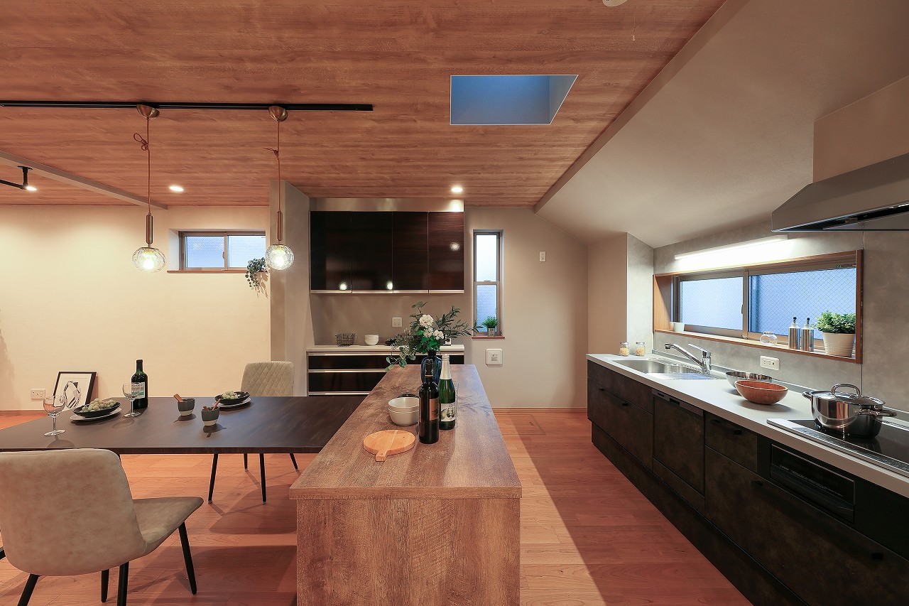 キッチンとダイニングテーブルの間には、グラフテクトの面材に近い仕上げの造作カウンターを製作。