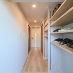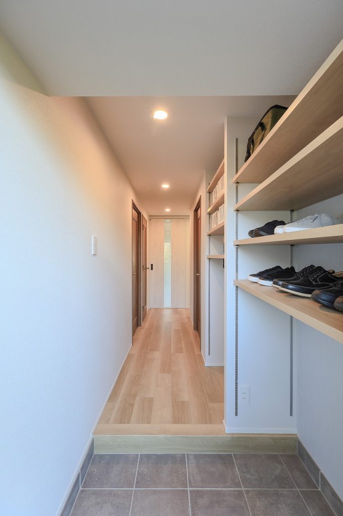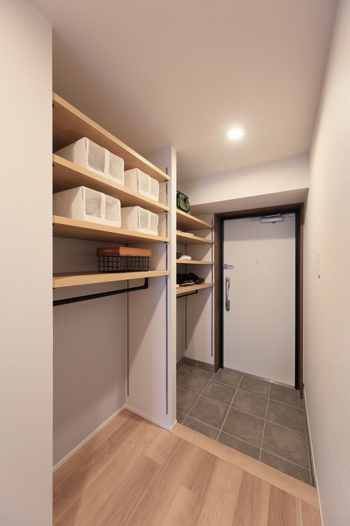 玄関横には大きな可動棚を設置し、