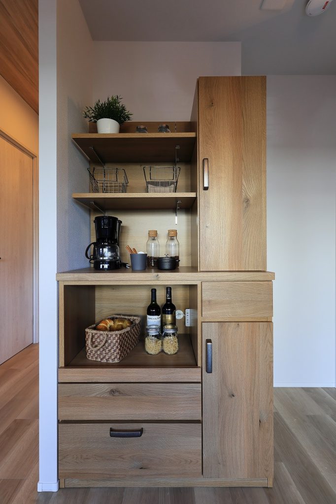今回のリノベーションでは、家具を増やさなくても生活できるよう、可動棚を中心とした収納計画を行いました。