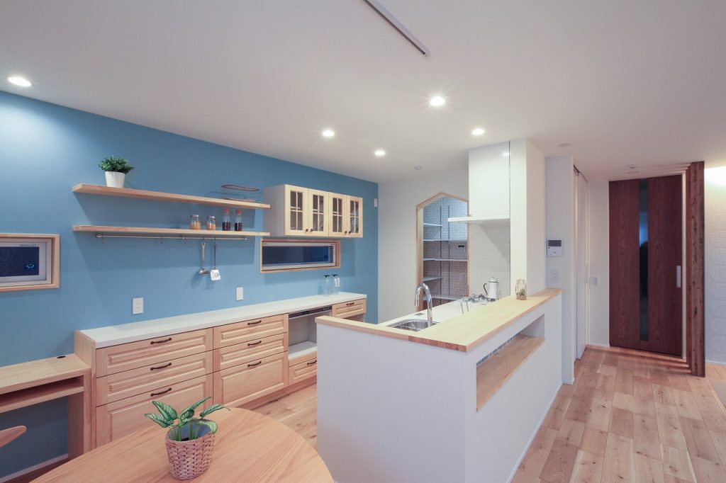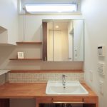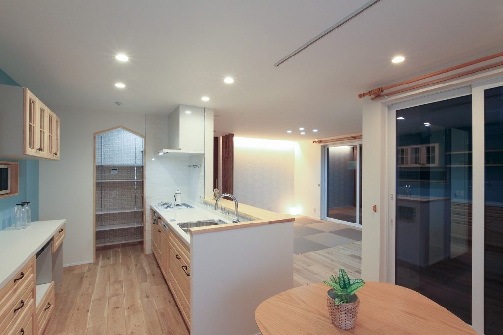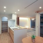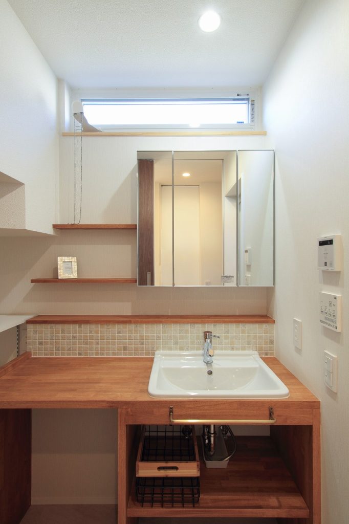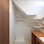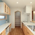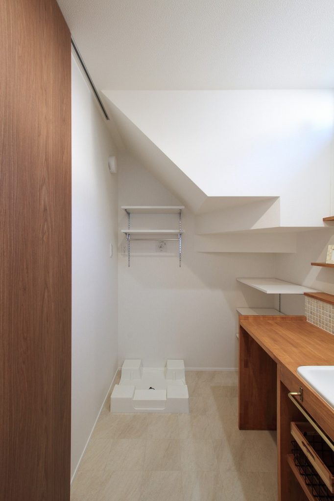 さらに、洗面室は広めに設計され、収納スペースも確保されています。キッチンには、家事を効率的にこなせるようにパントリーが設けられています。注文住宅ならではのカスタマイズが、日々の家事をより快適にしています。