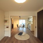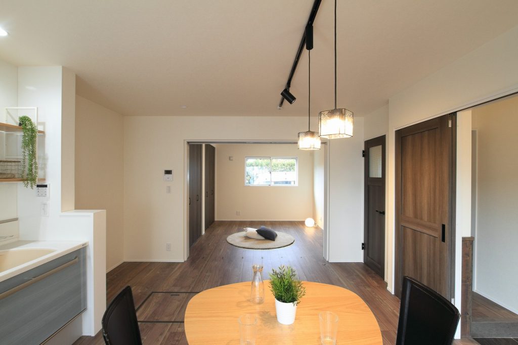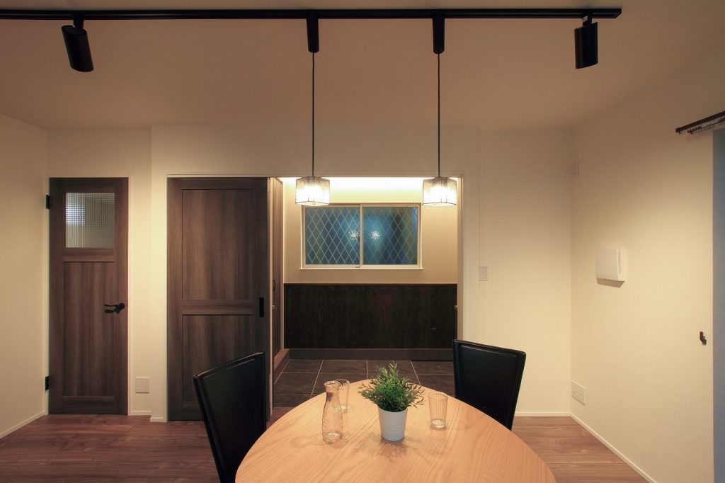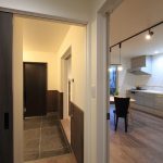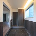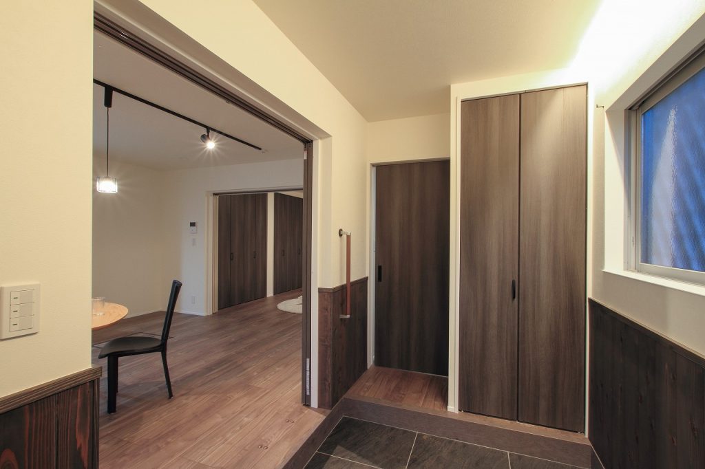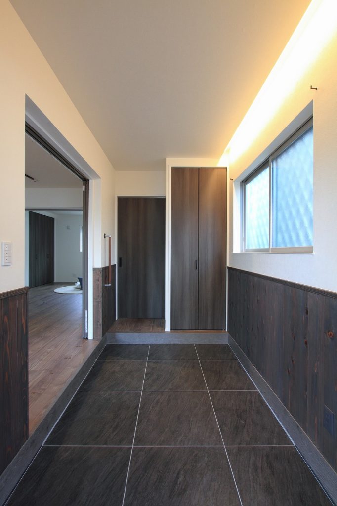 一方、お姉様の東側の世帯は、和とアンティーク調を融合させたデザインでコーディネートされています。この新築注文住宅の玄関は広く、自転車を収納するのにも十分なスペースがあります。また、自然塗料で仕上げられた杉板貼りの腰壁が、空間に温かみと特別な雰囲気を加えています。