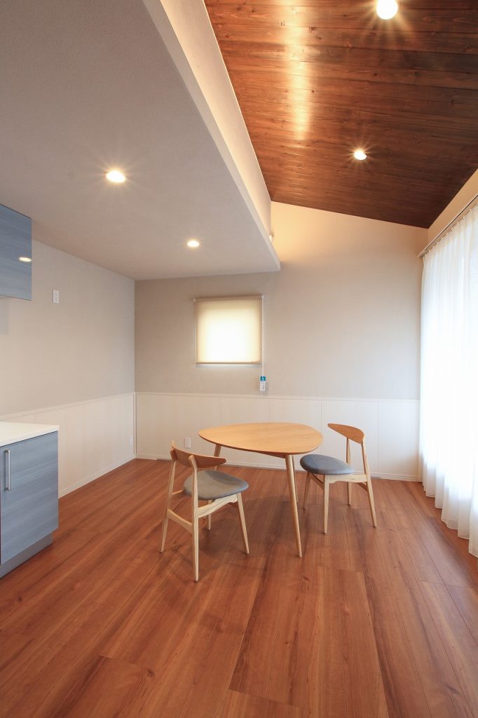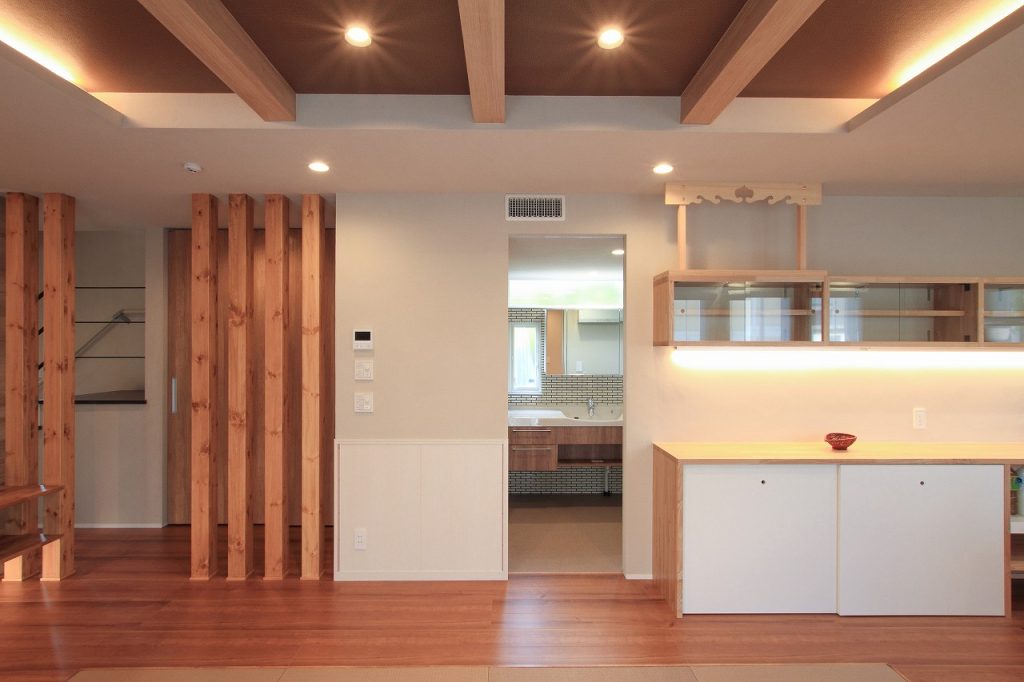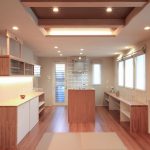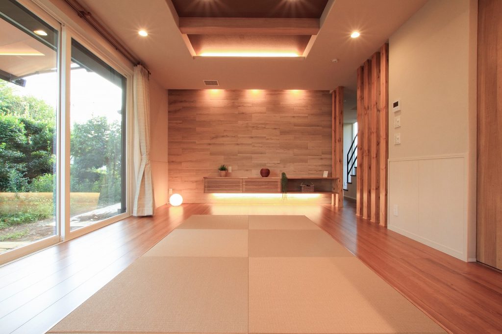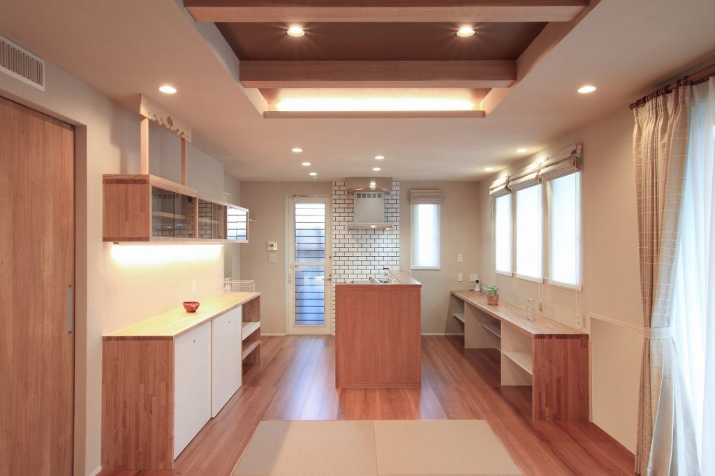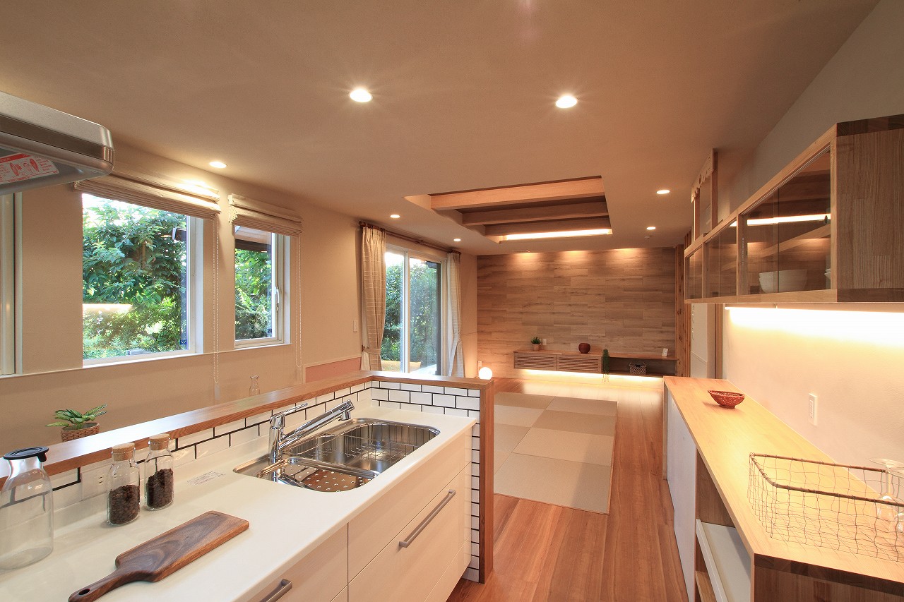リビングダイニングキッチン(LDK)は約20帖の広々とした空間に設計されており、ここには畳スペースも設けられています。この畳スペースは、三世代が集まり、ゆったりとくつろげる場所として機能します。畳の心地よい香りと感触は、日本の伝統と現代の住宅デザインが調和した空間を演出しています。