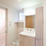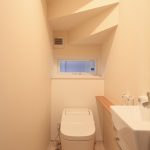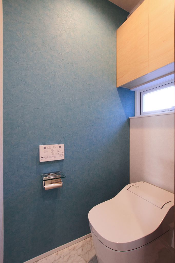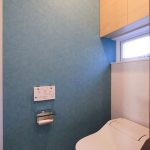 住宅の床材には、タイル貼りが採用されており、これが全体の明るさや雰囲気作りを一層高めています。そして、トイレにおいても、1階と2階で異なるデザインが採用されています。1階のトイレは背面収納を備え、2階のトイレにはシナ柄の造作吊戸が設けられており、床材には大理石調フロアやブルーのアクセントクロスを使用しています。これらの要素が、インテリア性の高い空間を生み出しています。