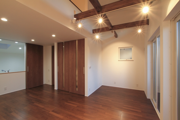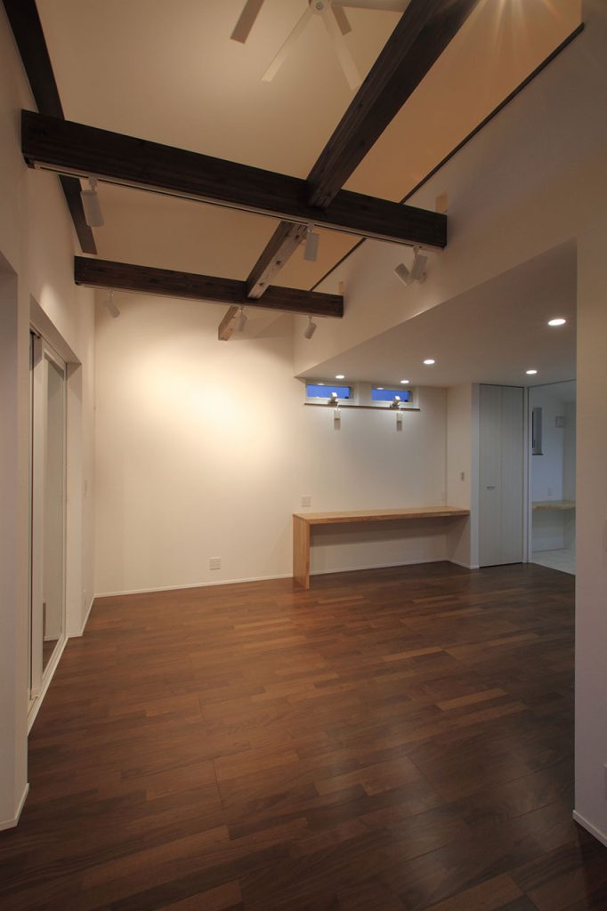 まず、リビングルームは2階に設置されています。この配置により、自然光が豊かに注ぐ、開放的な空間が生まれました。特に、吹き抜けのデザインはこの新築注文住宅の大きな特徴の一つです。天井まで届く掃き出しサッシの上部には明り取り窓が配置され、日中は外からの光がたっぷりと室内に入り込みます。また、梁の形状をあえて露出させることで、木のぬくもりを感じることができるようになっています。この明るく温かみのある空間は、住む人に安らぎを提供します。