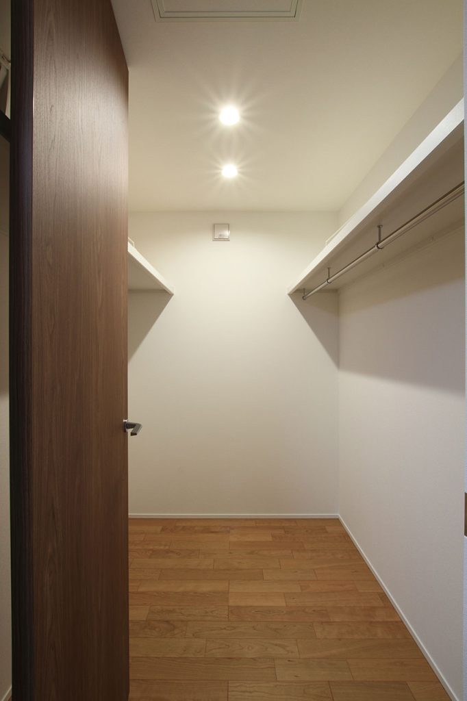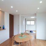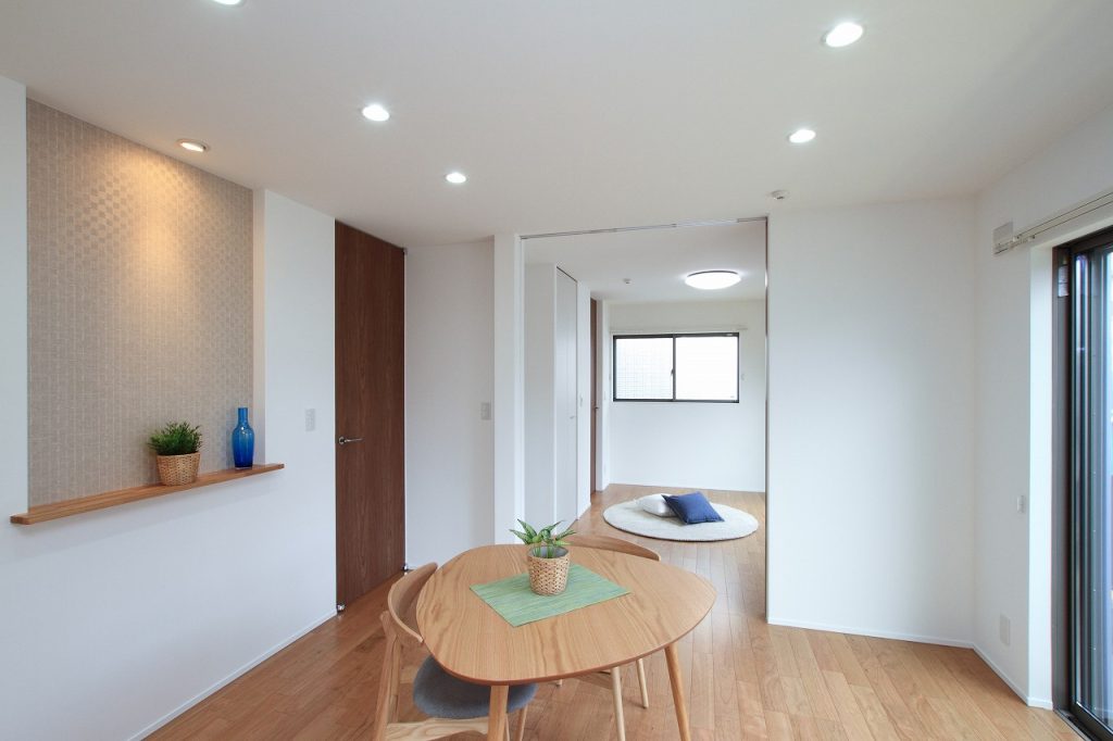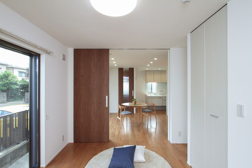 一人暮らしをされるS様のライフスタイルに合わせて設計されました。コンパクトながらも、生活に必要な機能をしっかりと備えており、快適かつ効率的な日常生活を送ることができるようになっています。LDKと寝室の間に設けられた天井までの3本引戸は、この新築注文住宅のユニークな特徴の一つです。この引戸を開ければ、空間は一つにつながり、より開放的な雰囲気を楽しむことができます。一方で、閉めればプライバシーが保たれ、静かな寝室空間を確保できるようになっています。