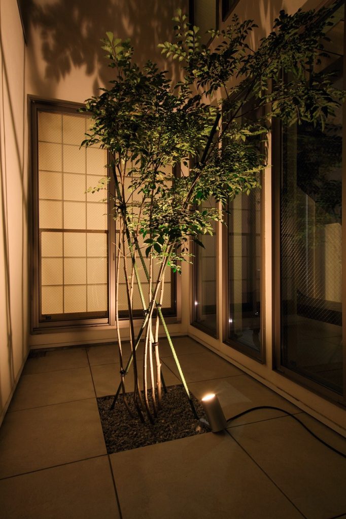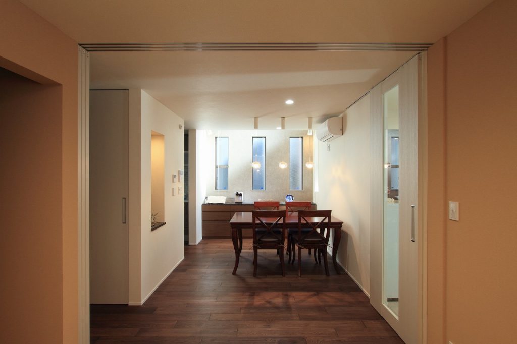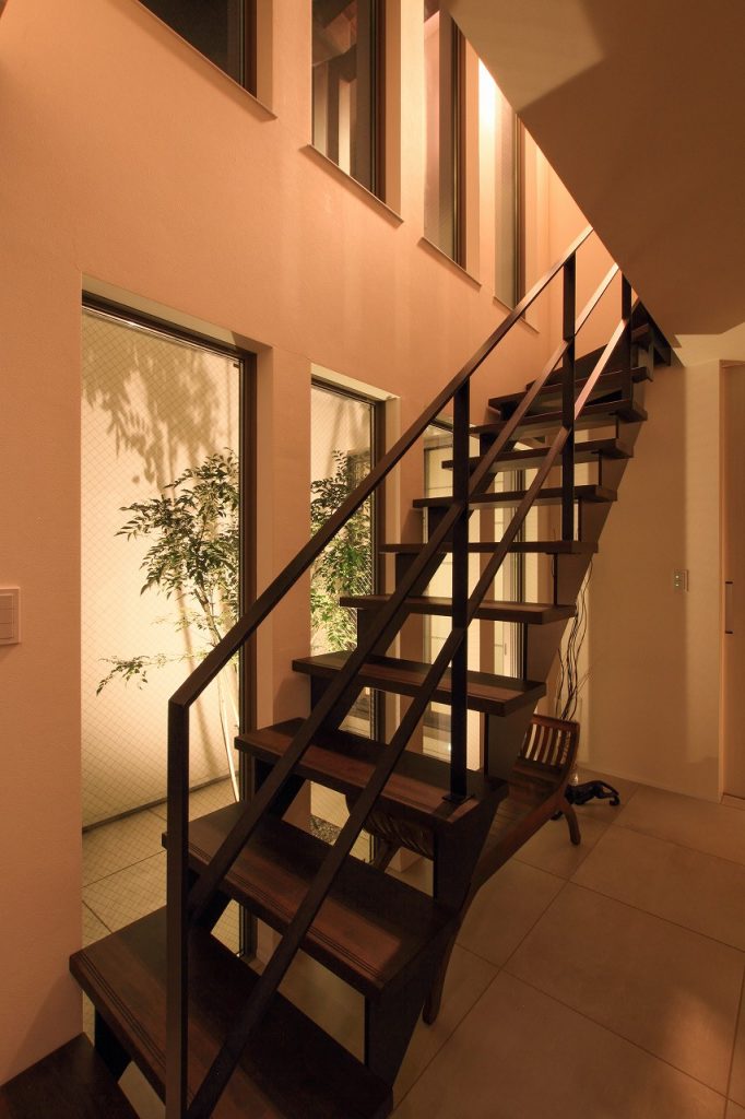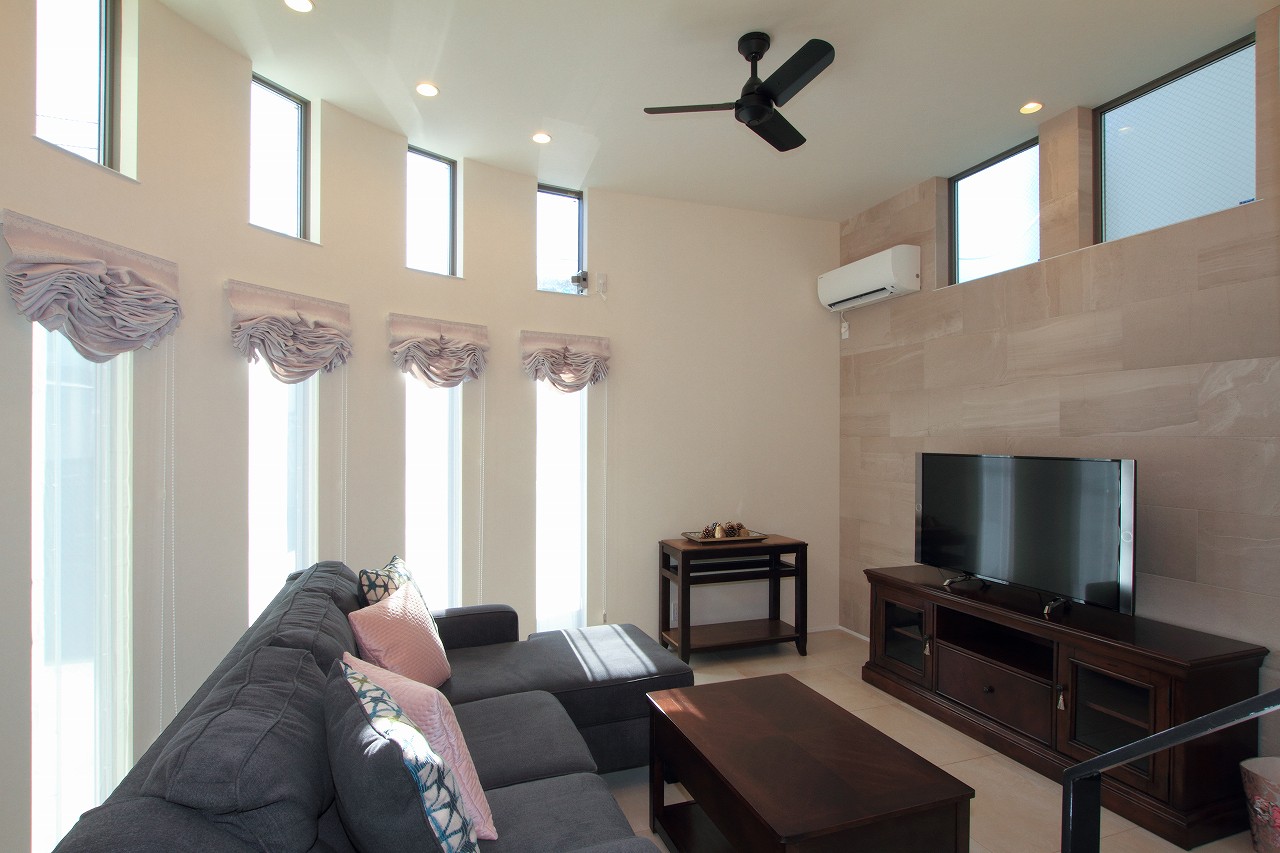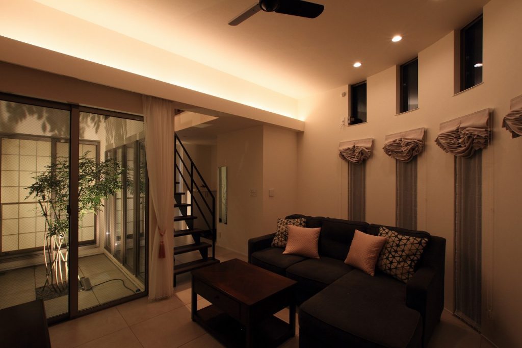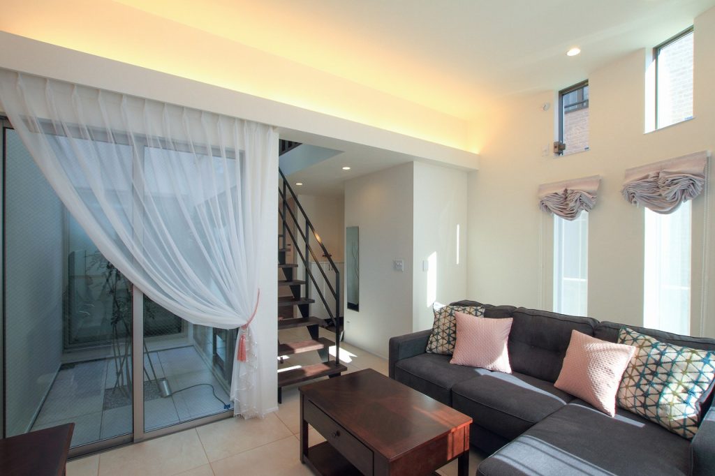 内部に目を移すと、新築注文住宅の中心とも言えるリビングスペースがあります。ここでは、吹き抜けの設計を採用し、開放感あふれる空間を実現しました。この吹き抜け空間は、中庭と繋がっており、リビング、玄関、和室から中庭の景色を楽しむことができます。まるで自然と一体化しているかのようなこの設計は、日常生活に穏やかな癒しをもたらします。