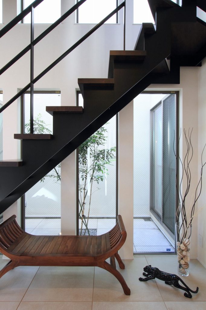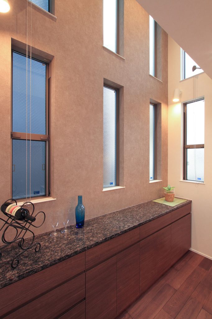階段は鉄骨のスケルトンを使用しています。これにより、空間の広がりと明るさを確保するとともに、モダンなデザインのアクセントを加えました。内装においては、床材や壁に高級感あふれるタイルを使用し、モダンで洗練された雰囲気を醸し出しています。ダイニングには造作家具のカウンターを設け、天板には天然石を使用しました。これが高級ホテルのような雰囲気をさらに高めています。