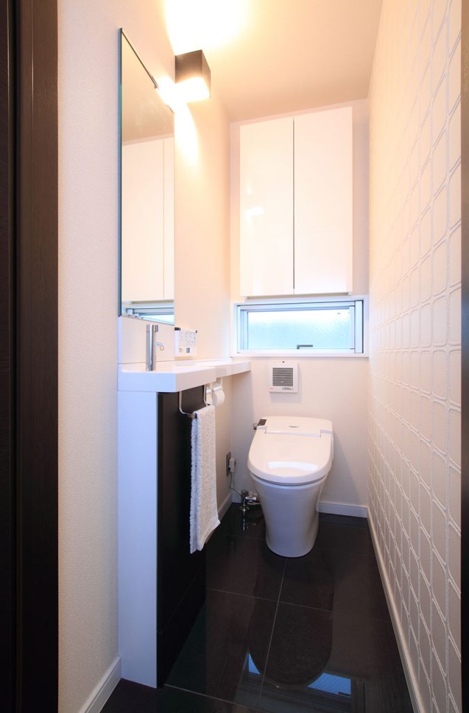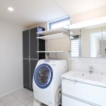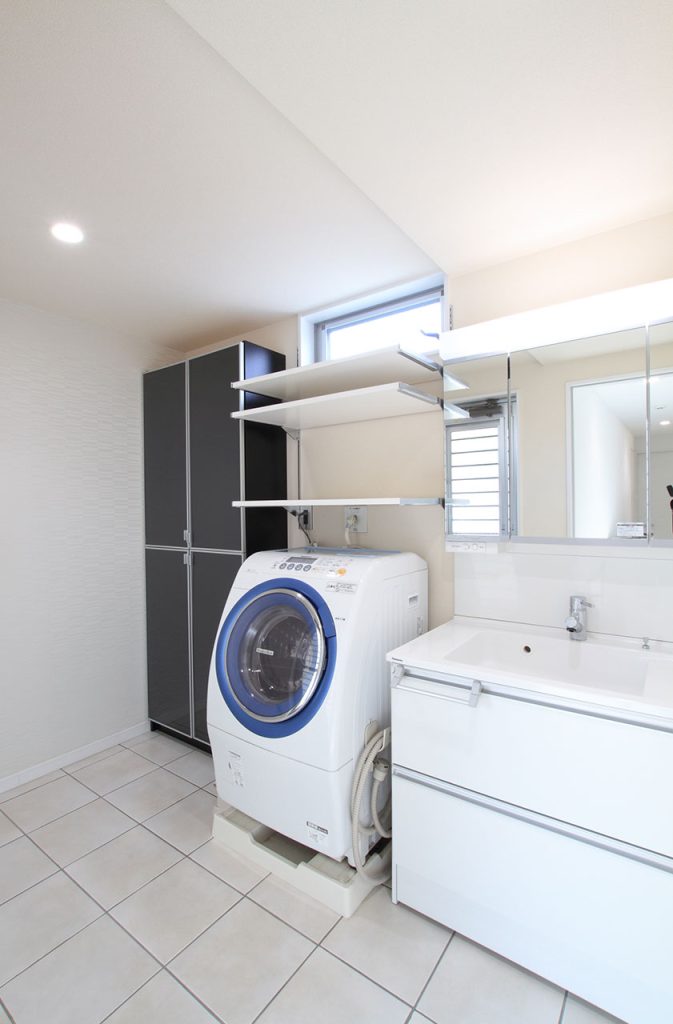 1階に位置する洗面室は、1.5坪の広さを確保し、洗面台、洗濯機、そして収納家具が配置できるようになっています。ここにはタオルや肌着、掃除道具などが収納でき、他の部屋の収納スペースを減らすことができます。このような収納計画は、注文住宅において家族の生活スタイルに合わせたカスタマイズが可能であることを示しています。