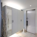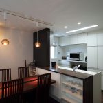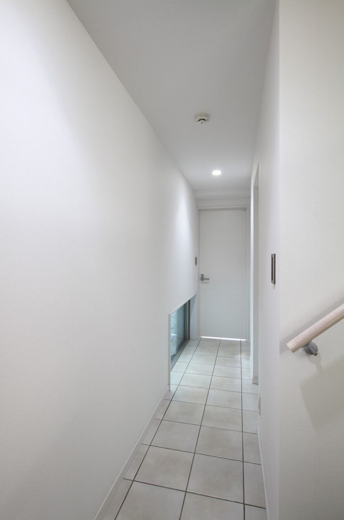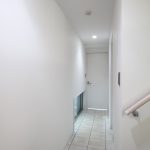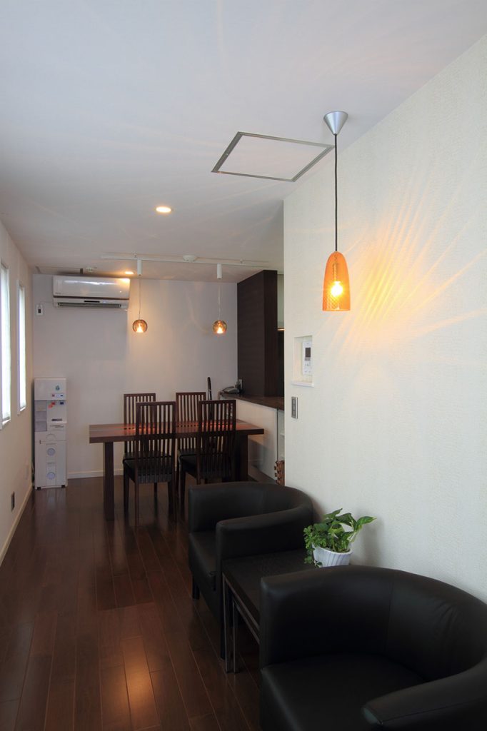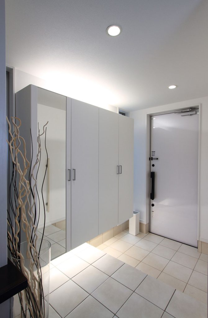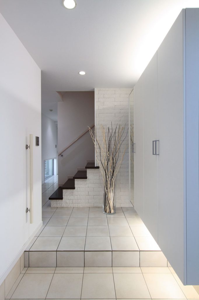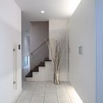 まず、この新築注文住宅の玄関を入ると、床と正面の壁に白いタイルが使用されており、明るく清潔感のある空間が広がっています。下駄箱の下には間接照明が施され、階段部分は一部をオープンにすることで、圧迫感をなくし、開放的な雰囲気を演出しています。これらのデザインは、注文住宅ならではの自由度の高い設計を反映しています。