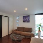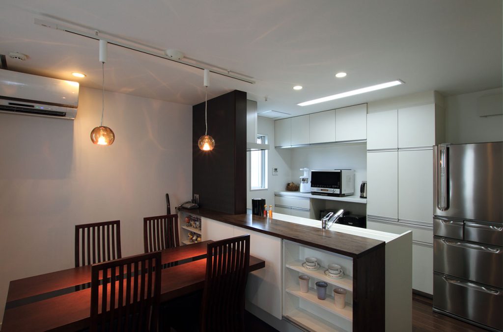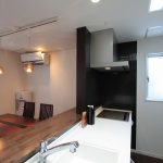 2階には、ダイニングキッチンとリビングが隣接しており、仕切りを設けずに一体感のある空間としています。廊下部分にはカフェテーブルと椅子が置かれ、西側の窓からの借景を活かし、それぞれの空間をつなげる役割を果たしています。この新築注文住宅は、住宅展示場で働いていた奥様と現場監督のご主人のアイデアと要望が詰まったもので、住み心地だけでなくデザインにもこだわっています。