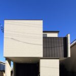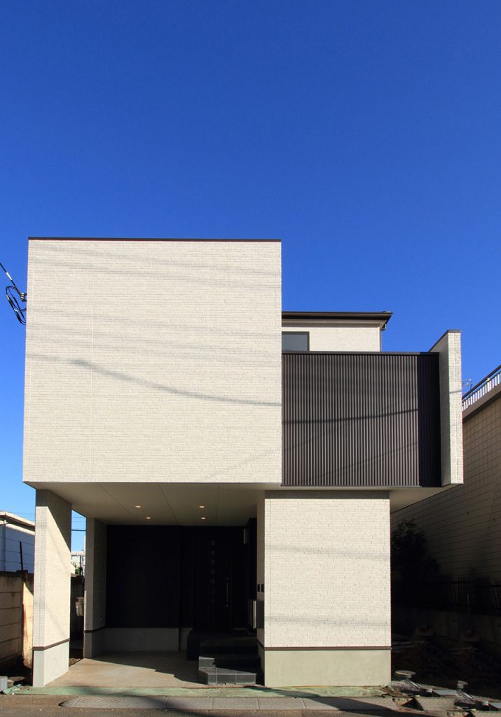 外観は、清潔感溢れる白を基調としたサイディングに、アクセントとしてシックな黒の金属サイディングを取り入れています。四角を組み合わせたデザインが、この新築注文住宅にモダンな雰囲気をもたらしています。