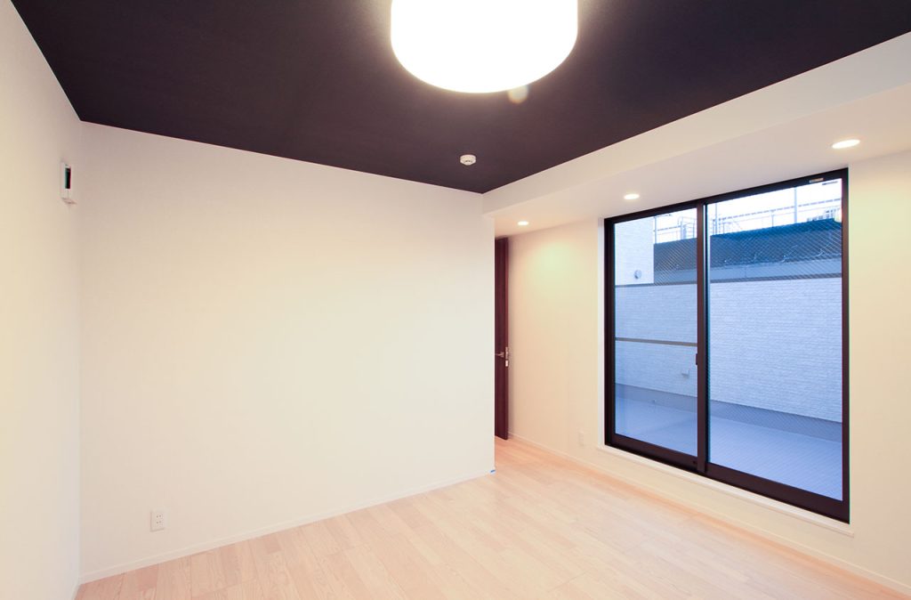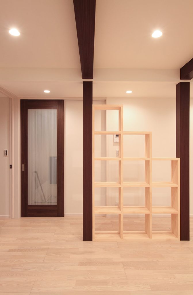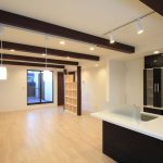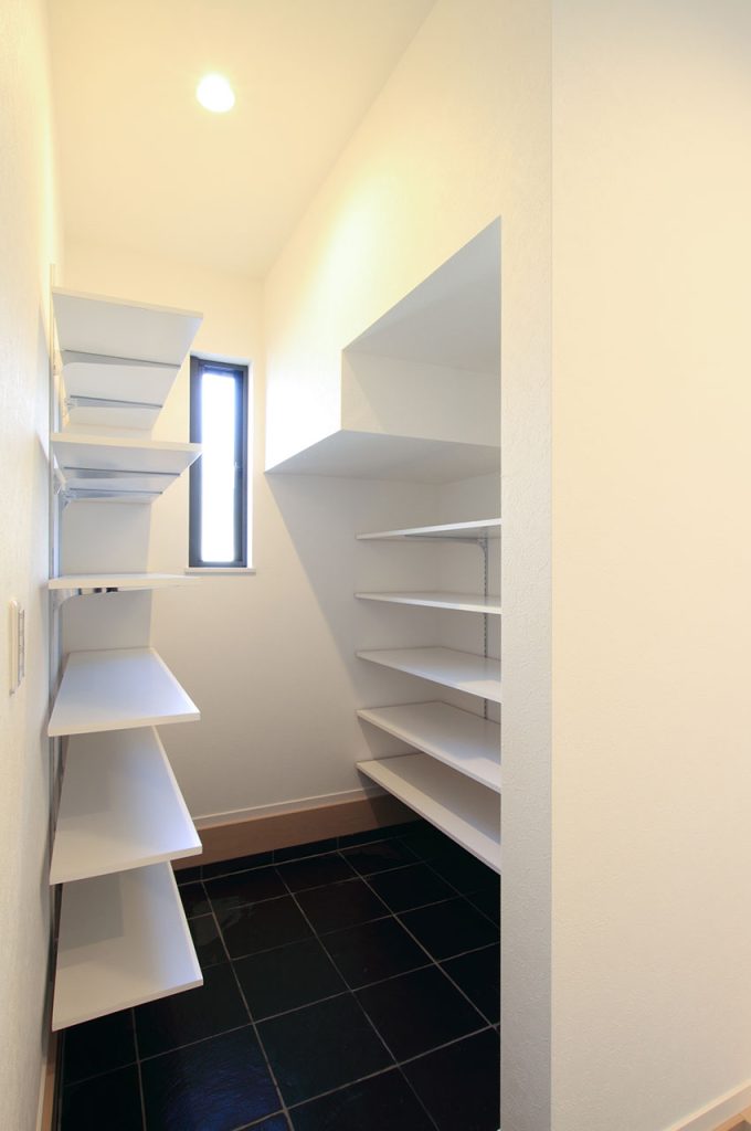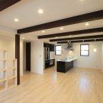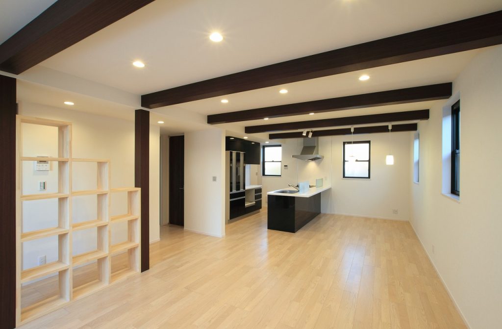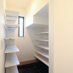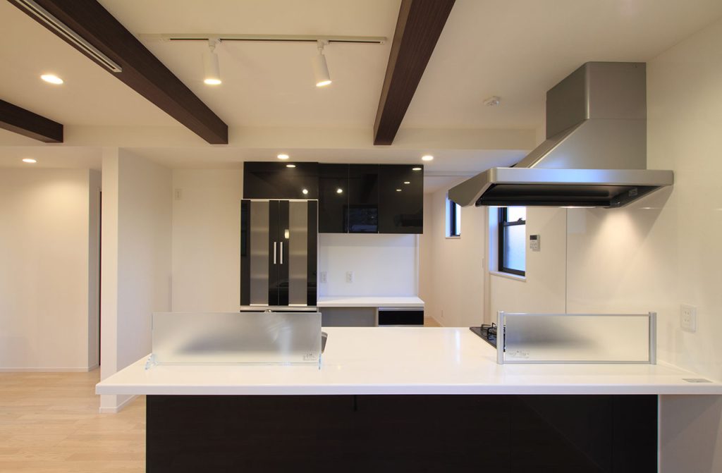 また、2階のキッチンには、食品庫を必要とするご要望に応えて、3畳の納戸を設置しました。この納戸は洗面室とも繋がっており、双方からの出入りが可能な設計となっています。1階とは異なる雰囲気を望まれた2階では、リビングの天井の高さを変え、こげ茶色の梁形状を見せることで、よりシックで上品な仕上がりの新築注文住宅となりました。