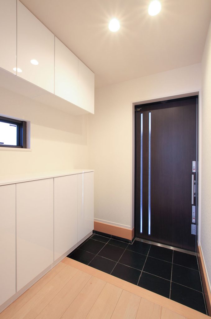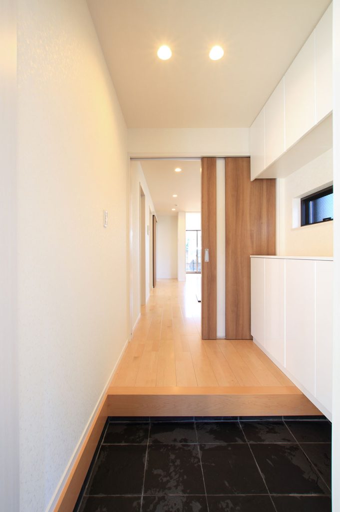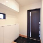 玄関には、大きなシューズクローゼットを配置し、「ベビーカーなども置けるように」というご希望に応えるため、階段下の空間と玄関の土間の高さを活かして、奥行きと幅の広い収納スペースを確保しました。このように、利便性と機能性を高める工夫が、注文住宅ならではの魅力を引き立てています。