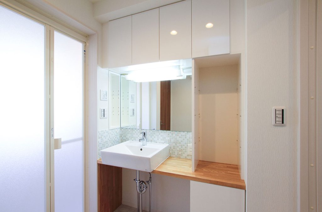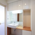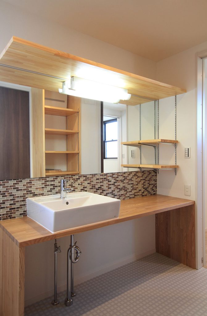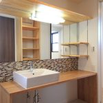 洗面室も、1階と2階にそれぞれ造作家具を用いて作り付けることで、オリジナル性と収納力を兼ね備えた空間に仕上がりました。注文住宅の特性を活かし、家族の生活スタイルに合わせたカスタマイズが施されています。