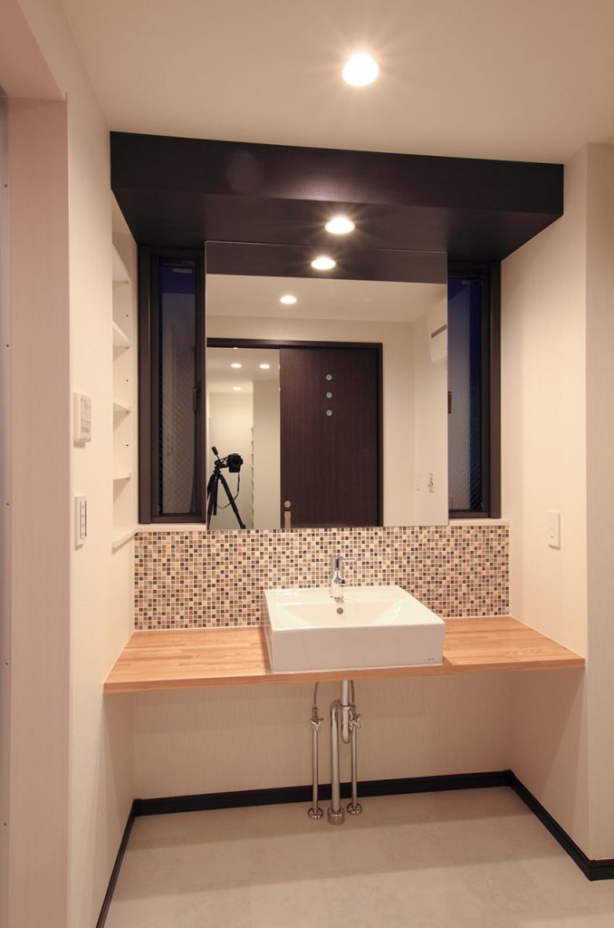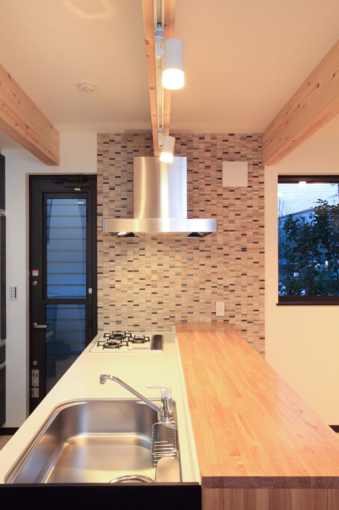 まず目を引くのは、1階にあるキッチンです。新築注文住宅ならではの自由度を活かし、M様邸ではI型のキッチンにカウンターを設置し、対面キッチンのような一体感を演出しています。このデザインは、家族のコミュニケーションを促し、キッチンでの時間をより豊かなものにします。また、コンロ脇に配されたモザイクタイルや、リビング正面のアクセントクロスが、空間に洗練された雰囲気を加えています。
