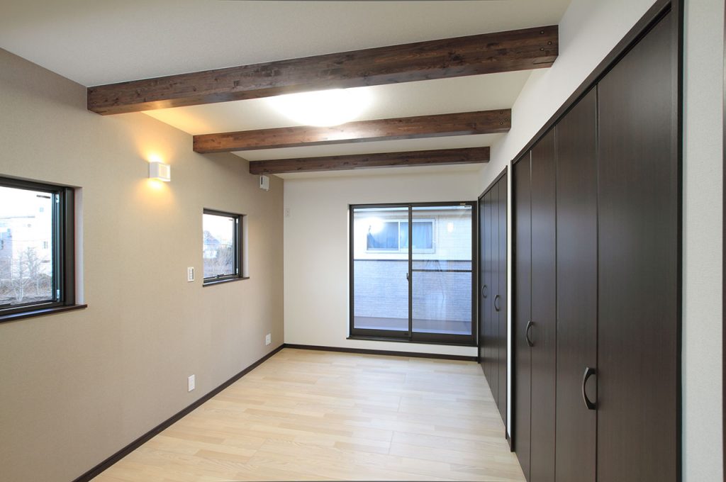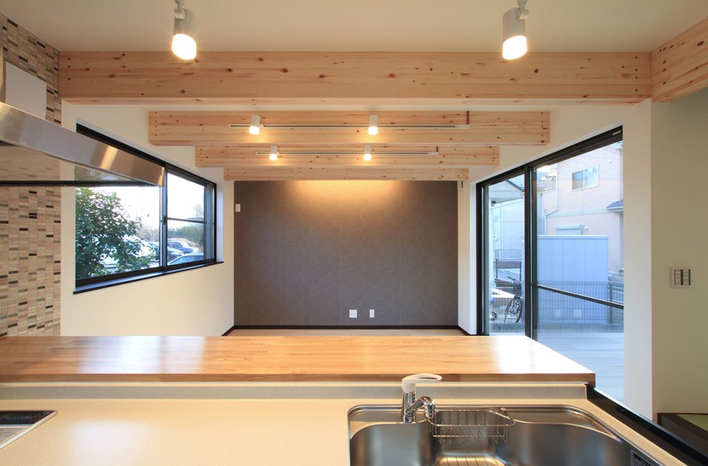 注文住宅の特徴として、自由なデザインの実現があります。M様邸の天井には、集成材の梁をそのまま見せるデザインを採用し、ナチュラルでありながらモダンな雰囲気を醸し出しています。木の柔らかな風合いが空間に温かみを与え、家族の心地良い時間を演出します。