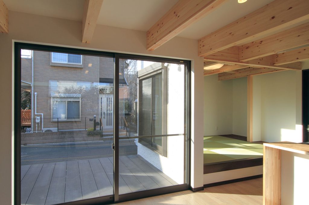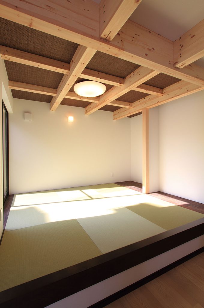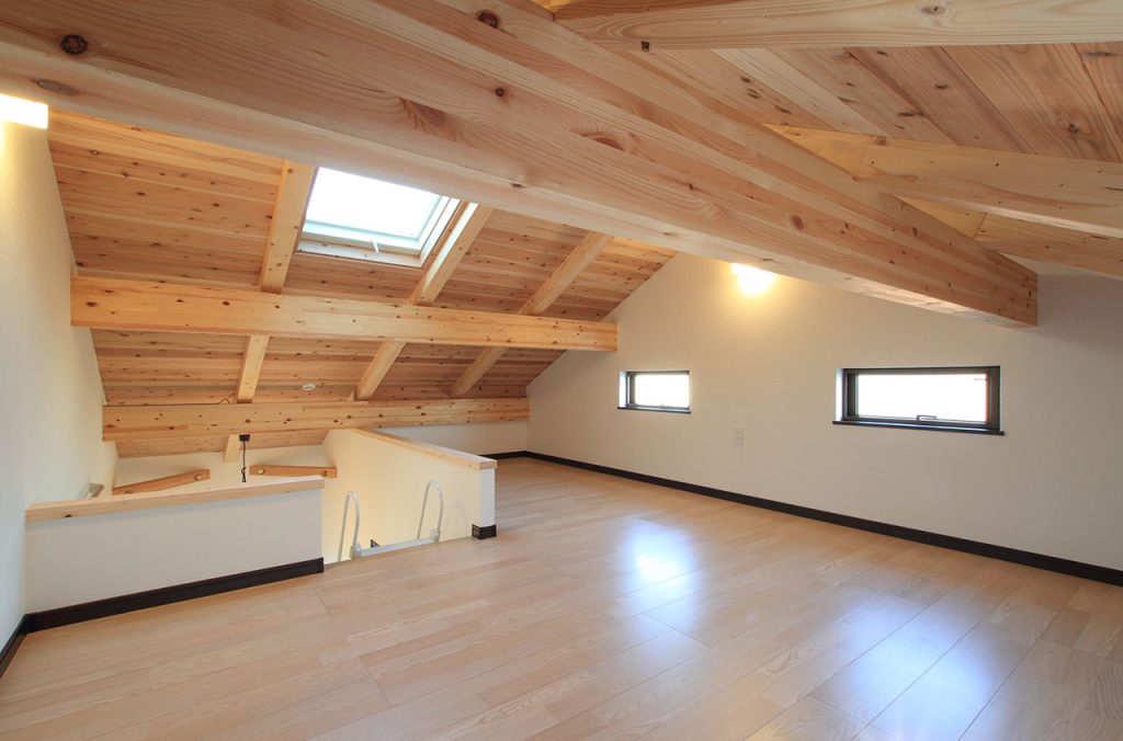 リビングと和室からウッドデッキへと続く動線は、屋内外のつながりを感じさせ、視覚的にも広がりを与えます。そして2階の吹き抜けや小屋裏収納の天井に杉の無垢板材を使用することで、全体に調湿効果と暖かみのある雰囲気をもたらしています。